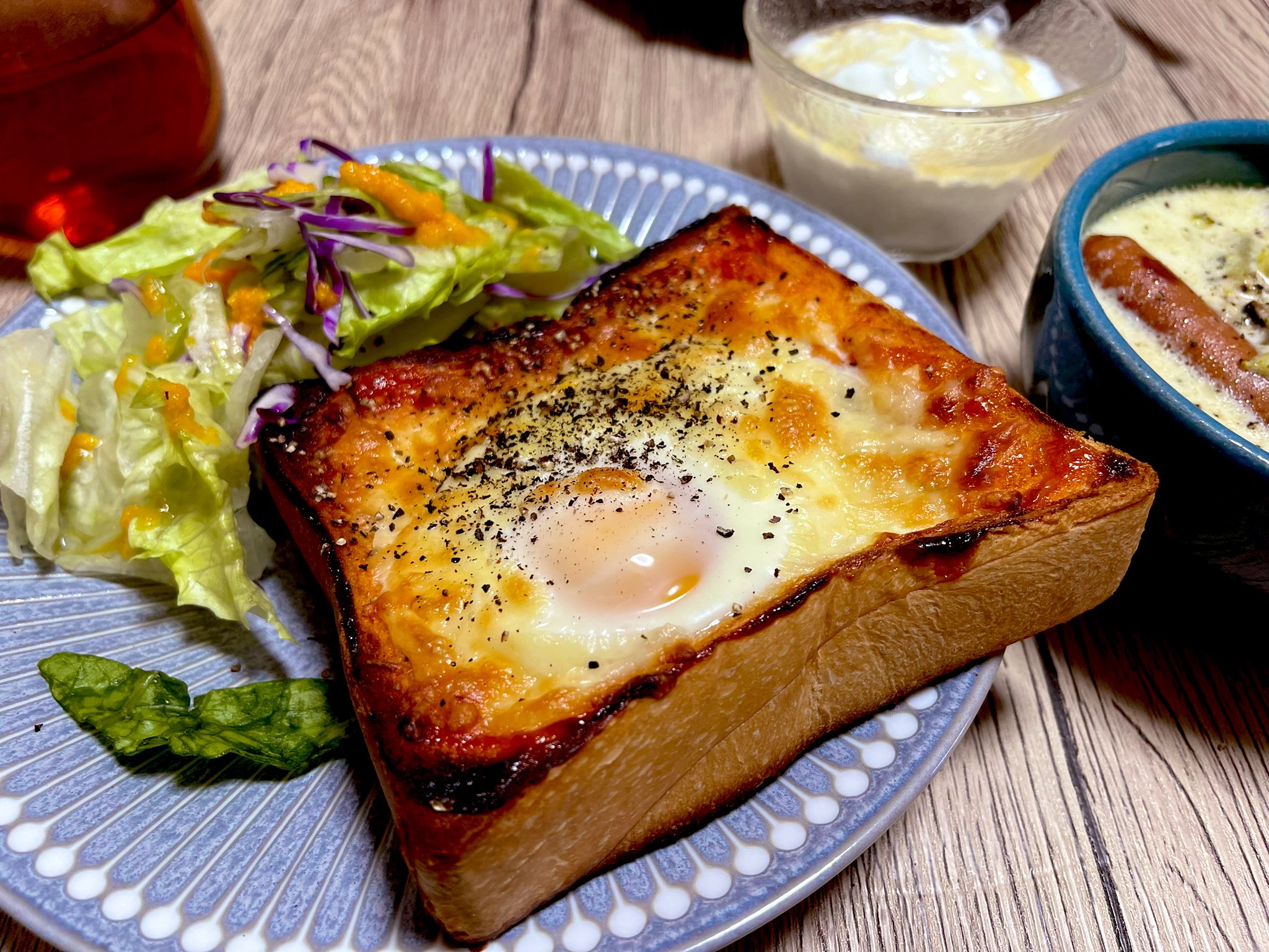 真ん中に、白身が色変わる程度に火を通した目玉焼き乗せてトースターで焼く