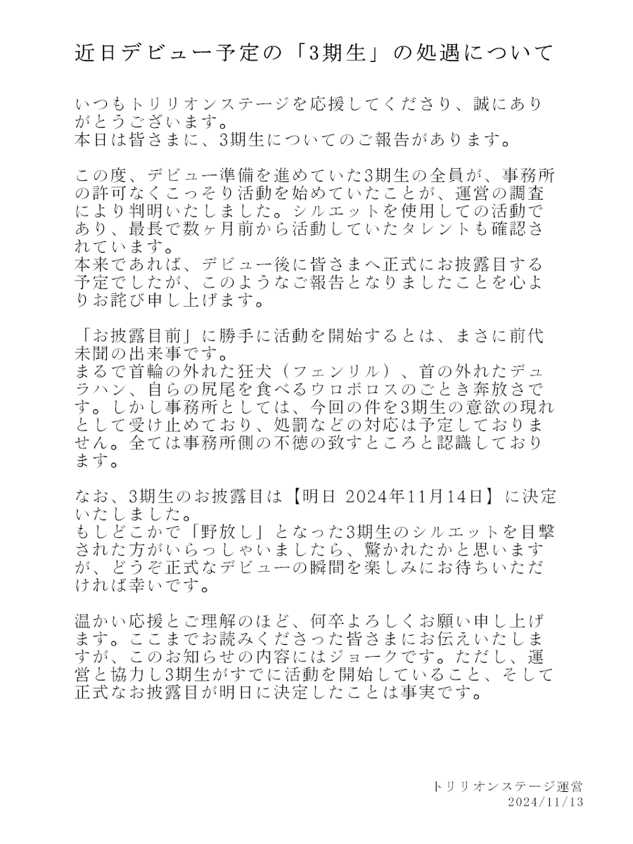 >デビュー準備を進めていた3期生の全員が事務所に許可なく